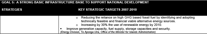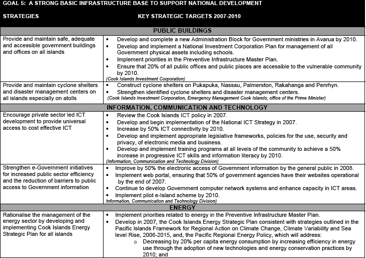 The Government acknowledges the importance of developing a national medium and long-term strategic plan to guide the development of the Cook Islands. Furthermore, Government recognises the importance of aligning its national development planning efforts with the key guiding principles articulated by its various international and regional commitments. The establishment of the ‘Te Kaveinga Nui’ process and in particular the National Sustainable Development Plan 2007-2010, provides the means of addressing both the medium and long-term direction of the Cook Islands and incorporating the country’s regional and international commitments into its national development planning efforts.